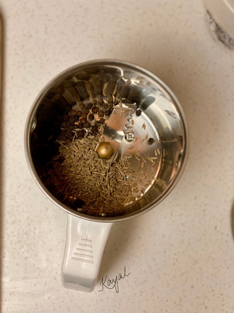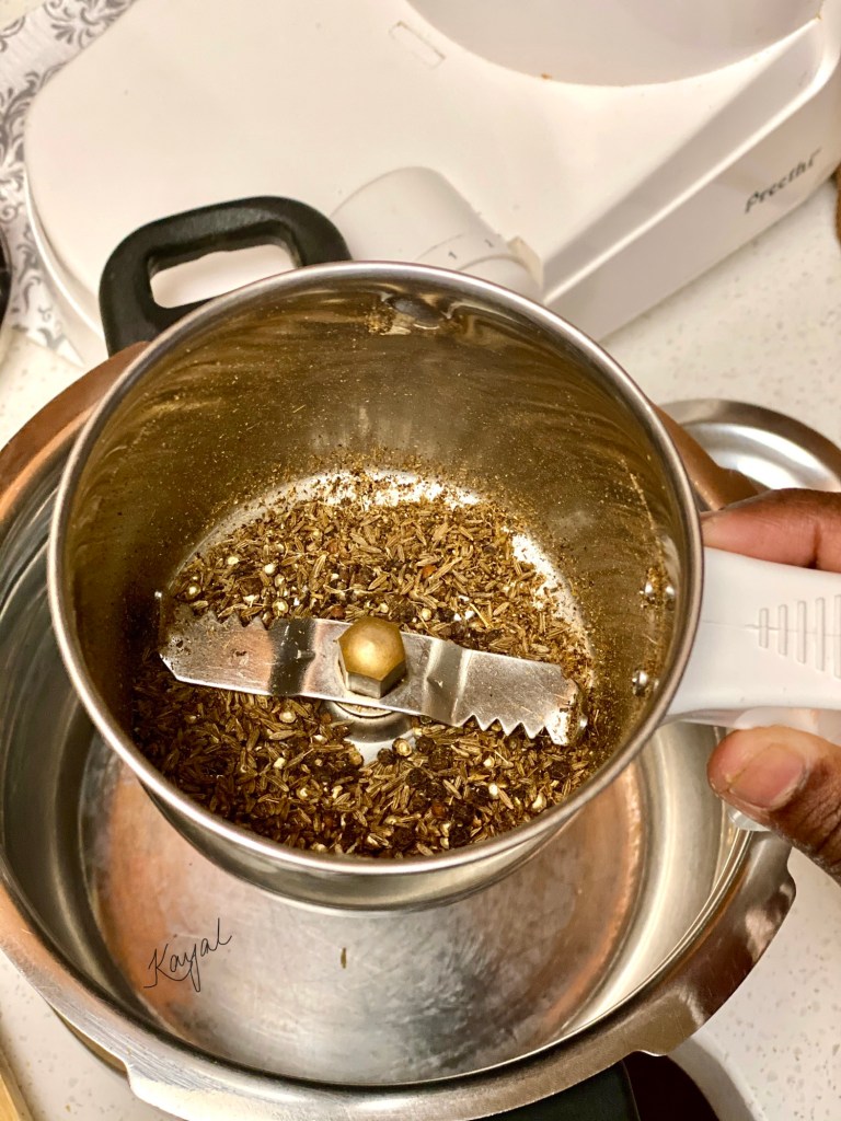 - In a small mixer jar, add in the jeera and pepper. Just grind it to a coarse powder using the pulse mode.