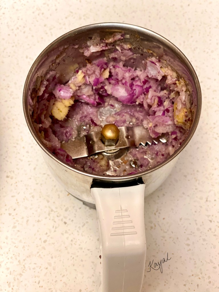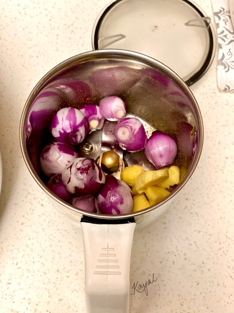 - Next add in the shallots and ginger to the mixer and grind them using the pulse mode. It should be a coarse mixture.