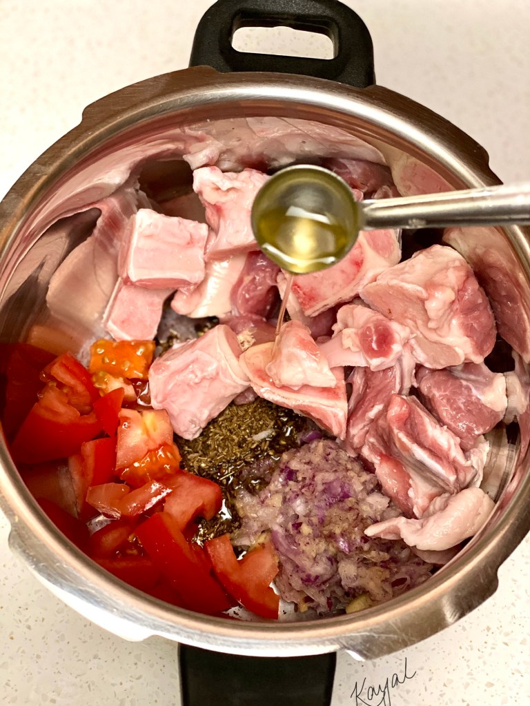 - In a pressure cooker, add in the mutton bones, turmeric powder, ground pepper and jeera, ground onion and ginger and 3 tsp nallennai. Add in water till all the ingredients are just soaked enough, around 2.5 cups water.