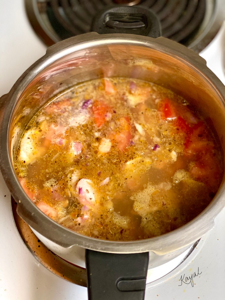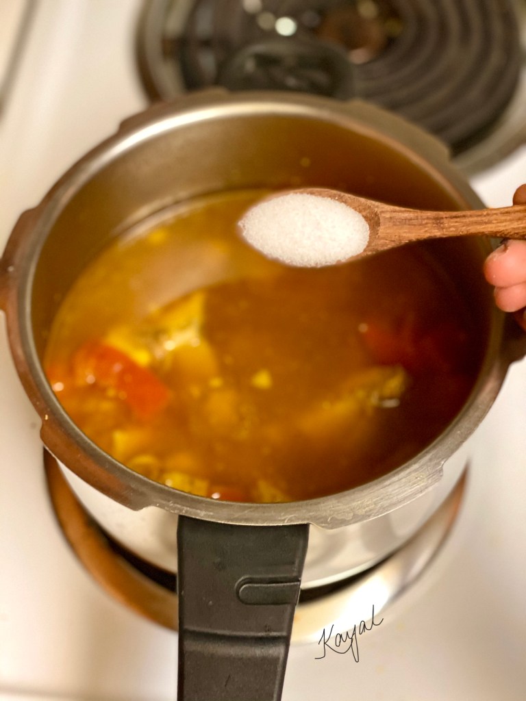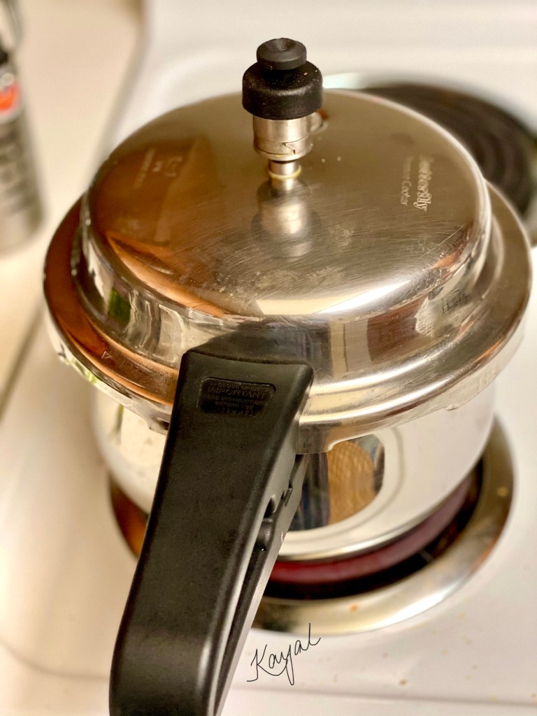 - Now switch on the stove, and heat up all the ingredients. Close the cooker and cook in medium flame for 6 whistles and simmer for 10 mins.