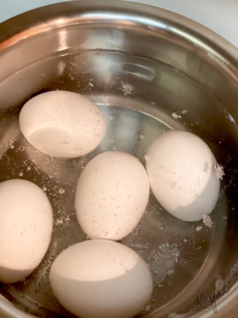 - Boil eggs in a wide vessel. Add in 1 tsp salt to boiling water. Then add in the eggs. Boil in medium flame for 10 mins. Drain and fill the vessel with cold water to stop the cooking process.