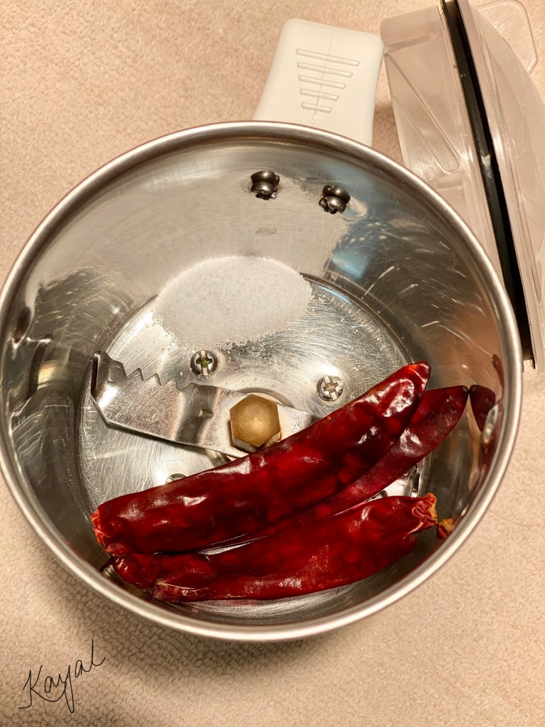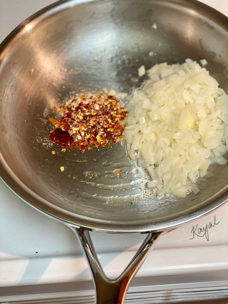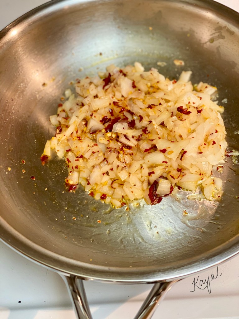 - Add oil to a kadai. Once the oil is hot, add in the onions and saute till translucent. Then add in the powdered salt and red chilli.
