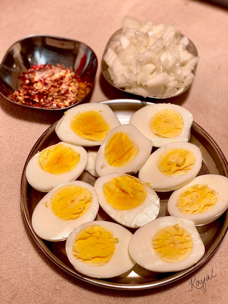 - Grind rock salt and red chillies to a powder. Break the egg shell and cut each egg to half. Also chop the onion and keep it aside.