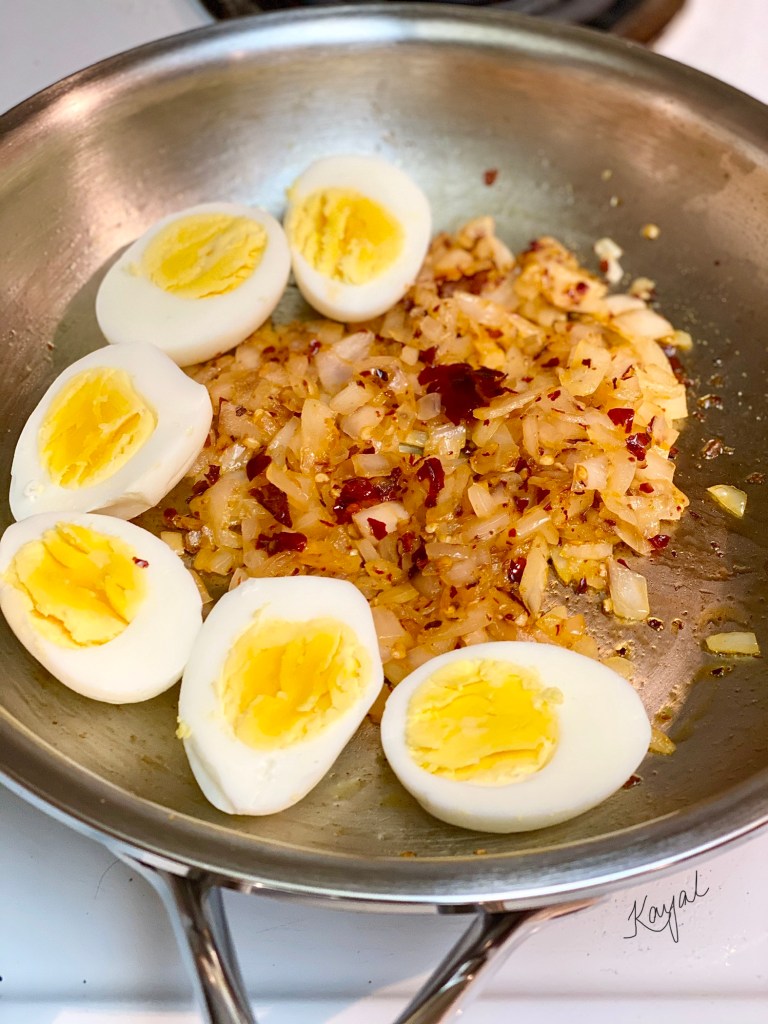 - Saute till raw smell goes off from red chilli. Add in eggs and mix well so that all the sides are coated evenly. Simmer for 3 to 4 mins and serve hot.