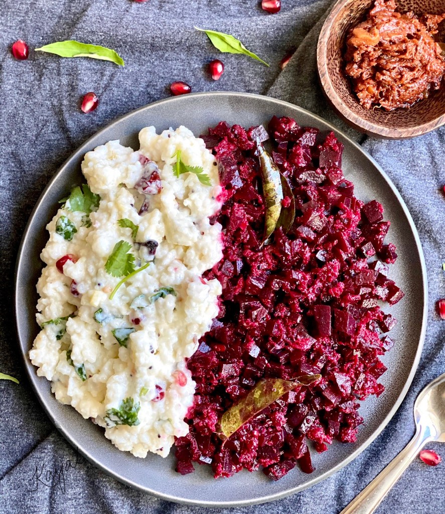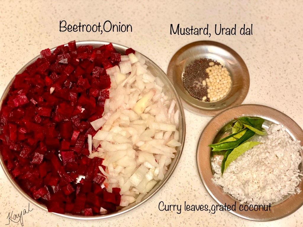 Beetroot poriyal is a South-Indian style vegetable side-dish. Beetroot is a colorful vegetable that is rich in folate. It is also a source of fiber, manganese and potassium. It also helps reduce cholesterol levels and relieves constipation. It is a powerhouse of antioxidants which is very healthy for the skin.