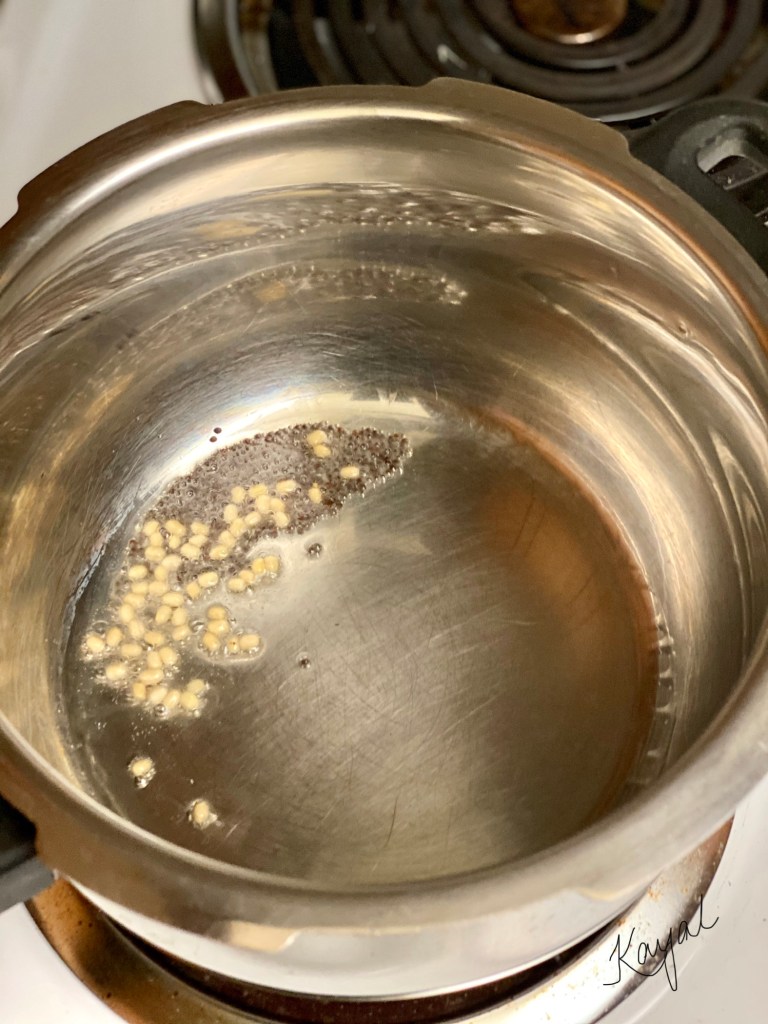 - Once the oil is warm, add in mustard seeds and urad dal.