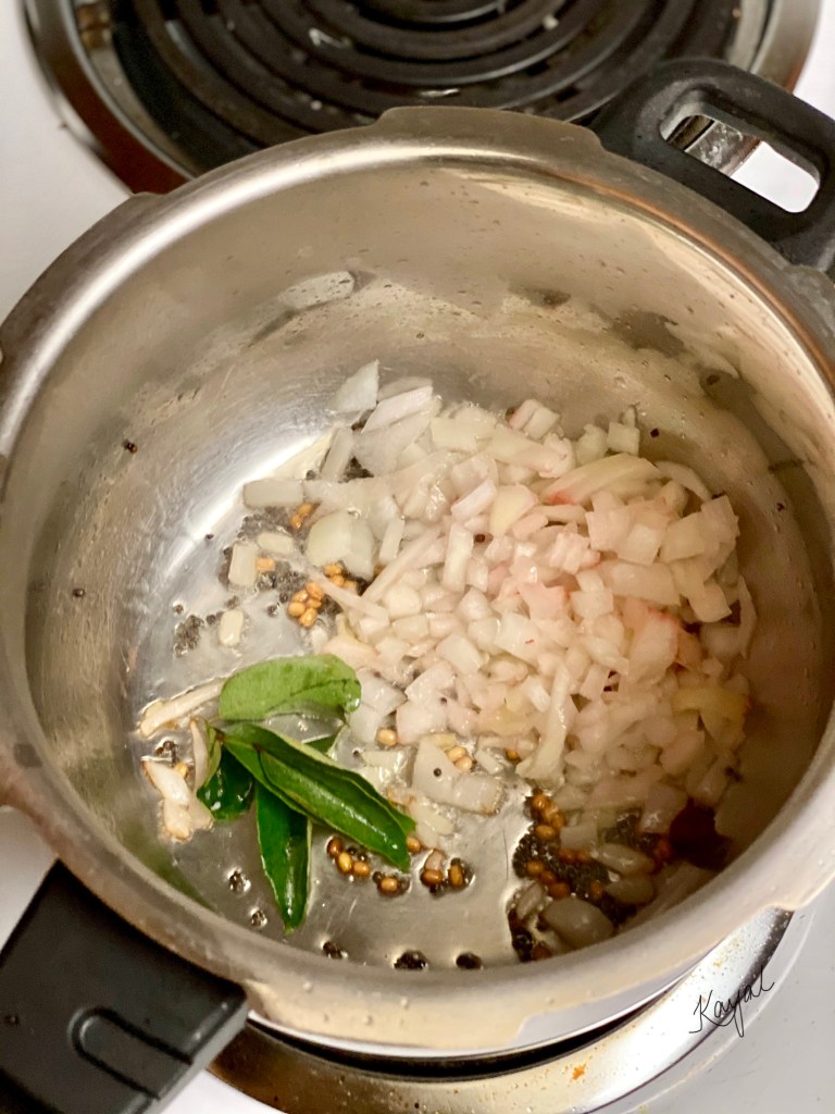 - Once the mustard splutters and the urad dal turns golden brown, add in the curry leaves and onion.
