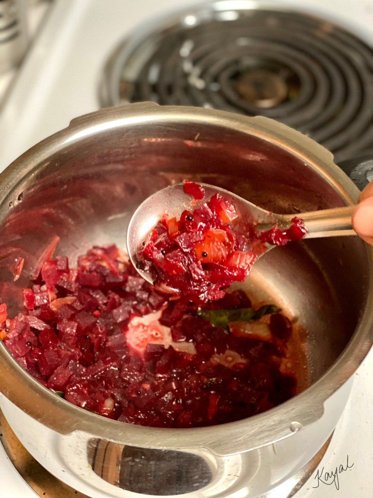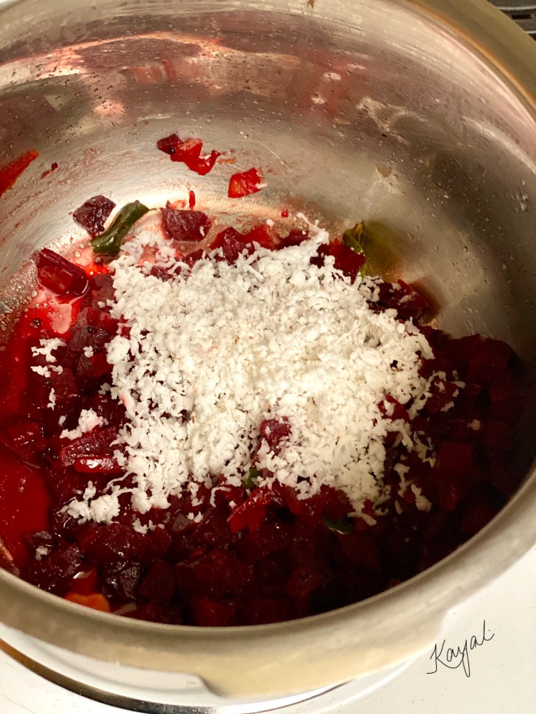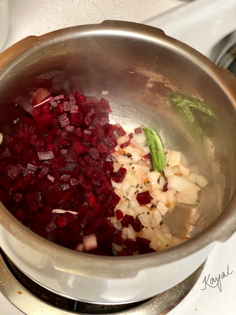 - Do not add more water or cook beyond the mentioned time. Else beetroot will become mushy and lose its texture.