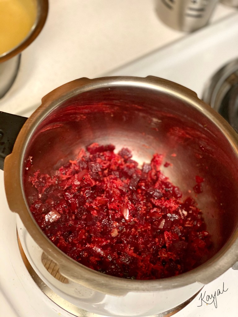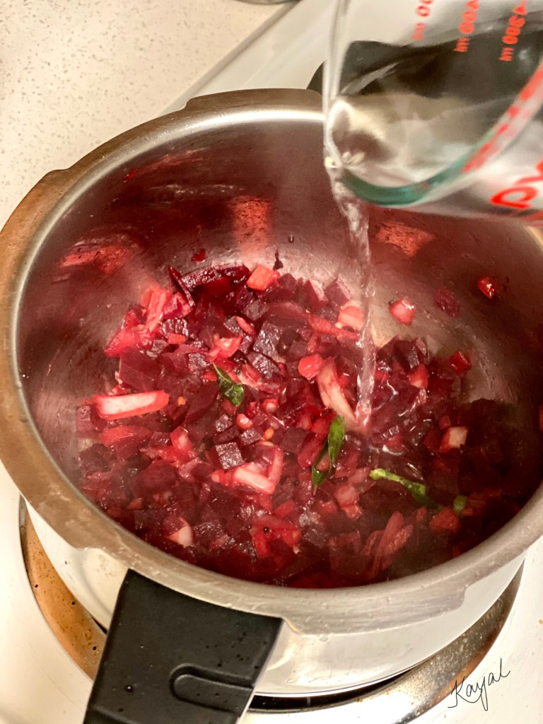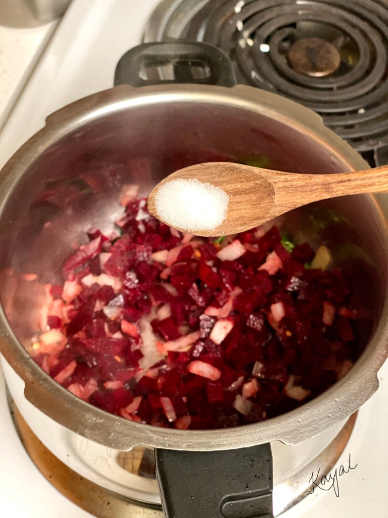 - Add in the beetroot and add 1/2 tsp salt. Saute for a minute.