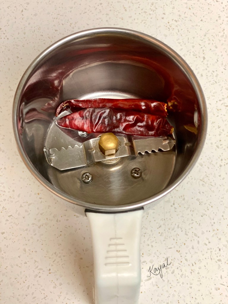 - In a small mixie jar, add dry red chillies first and grind it to a powder.