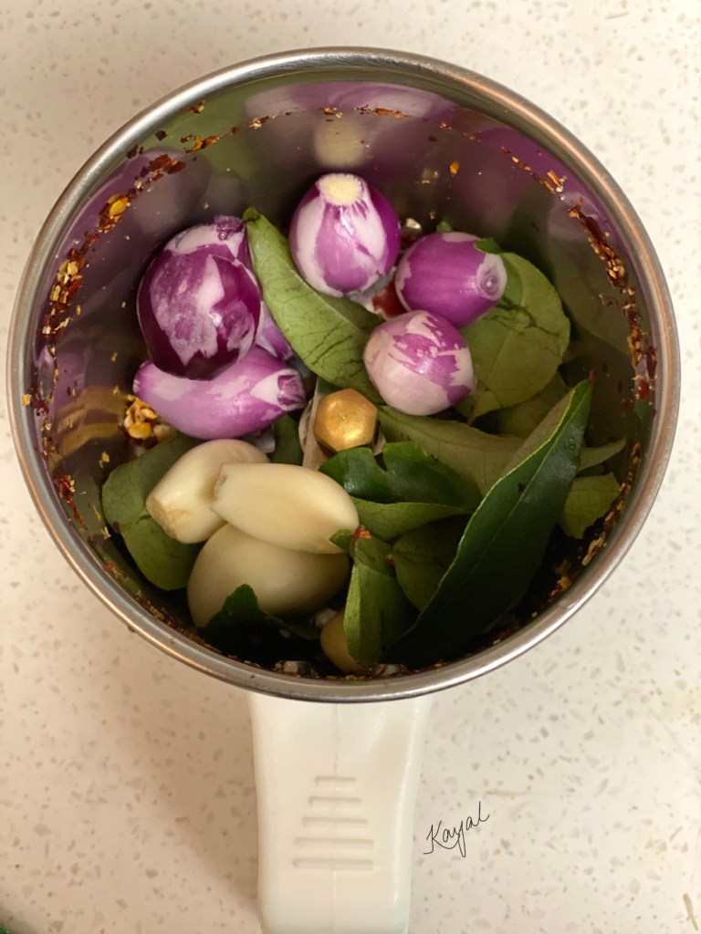 - Then, add in the small onion, garlic and curry leaves. Grind it along with the powdered red chilli to a coarse paste.