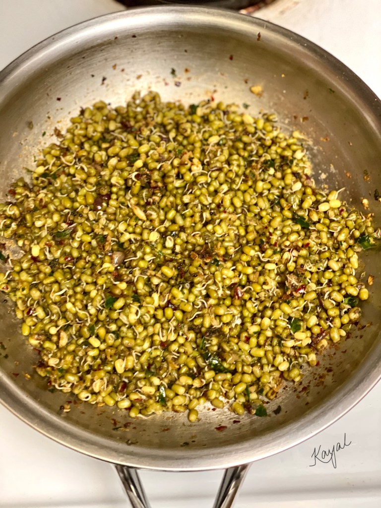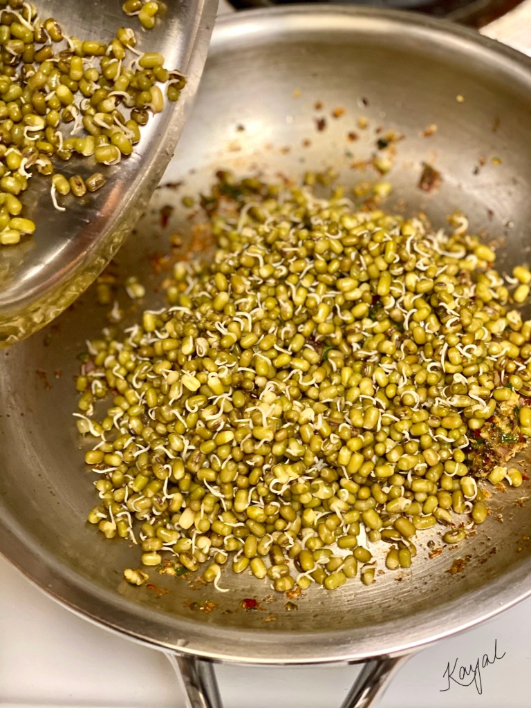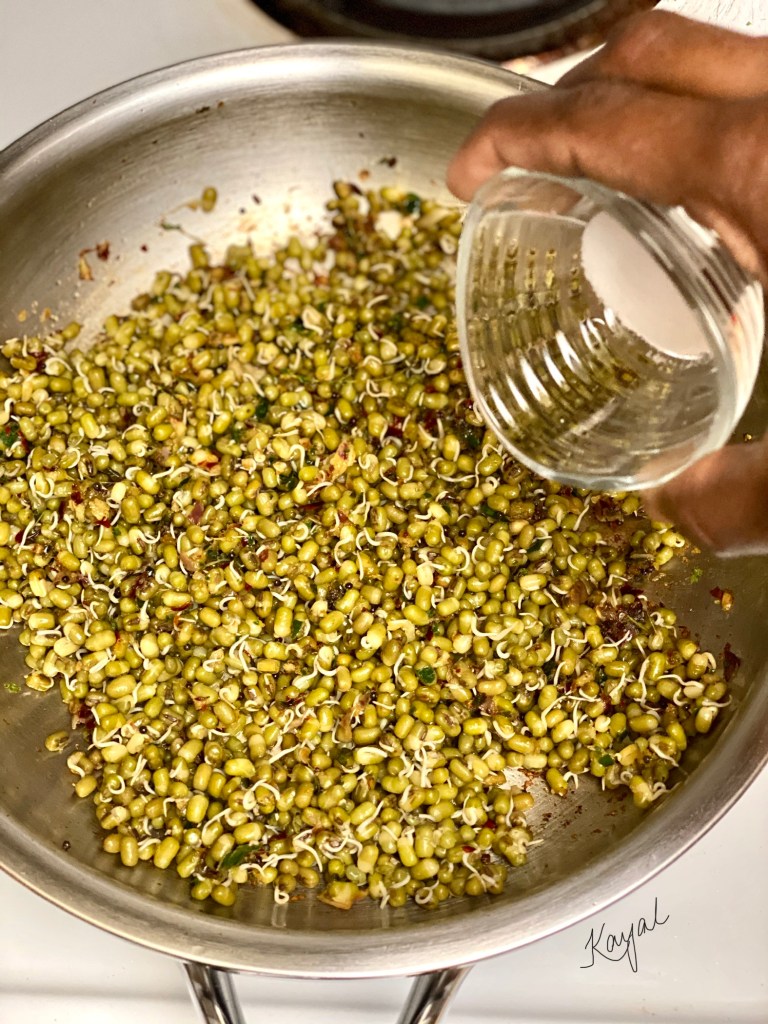 - Do not leave the vessel unattended as it will get burnt easily. The sprouts need to be just done, else it will become mushy. All the water should have been evaporated.