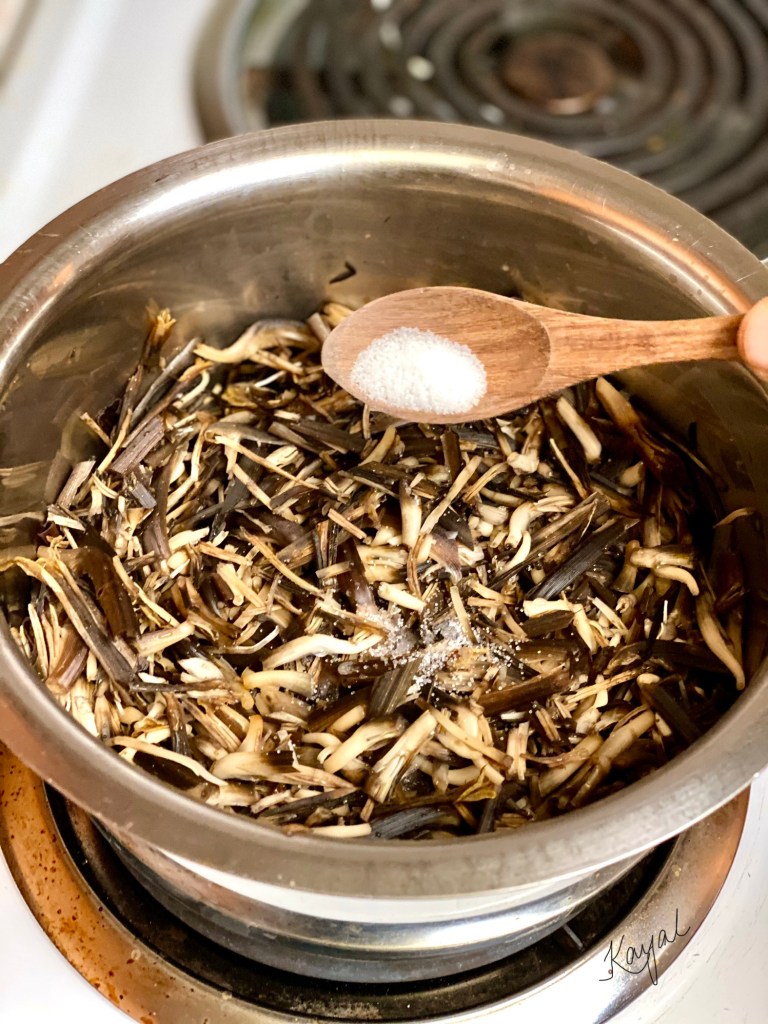 - Cook the chopped vazhaipoo in a pan with 1/4 cup water + 1/2 tsp salt for 5 to 7 mins. Close the pan with a lid and cook in medium flame. Drain in a colander.