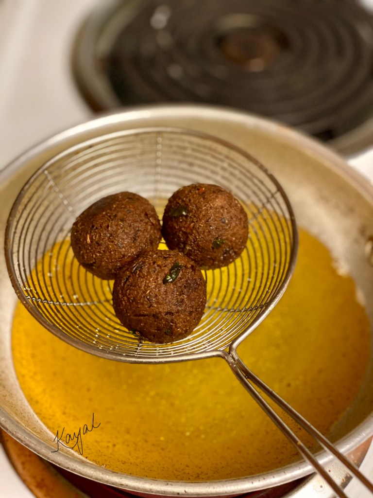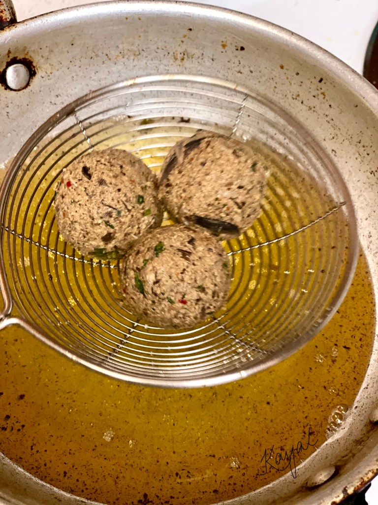 - Once the oil is hot, add 3 balls at a time. Do not overcrowd the pan while deep frying.