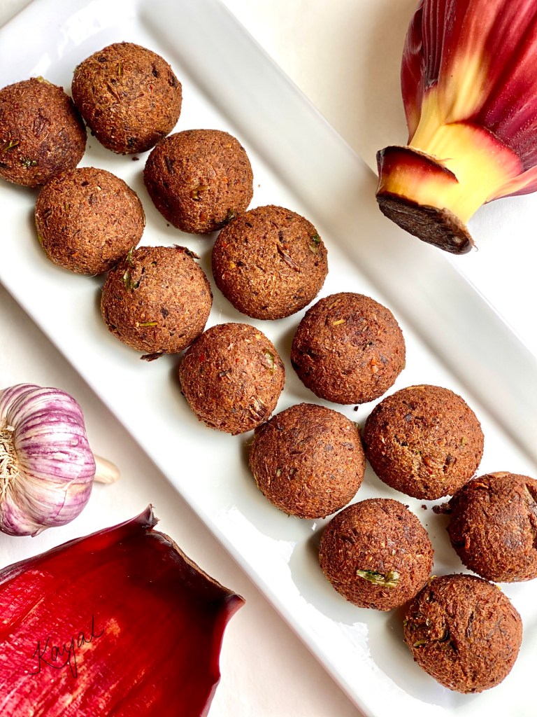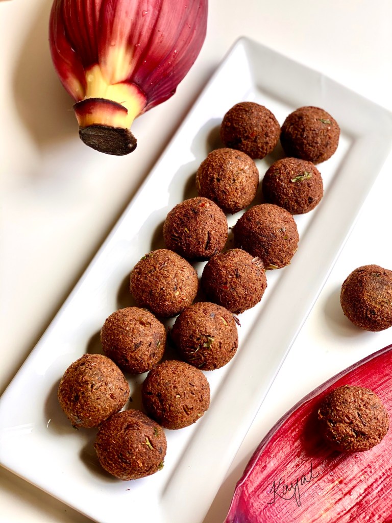 Vazhaipoo kola urundai is a vegetarian deep fried appetizer / side-dish that is made by using Vazhaipoo / Banana Blossom as the main ingredient. We add few other flavorful ingredients along with vazhaipoo, that makes this dish a burst of flavors. This dish is very addictive. You can’t stop with one! Everything is ground and made to small balls and deep fried. As simple as that.