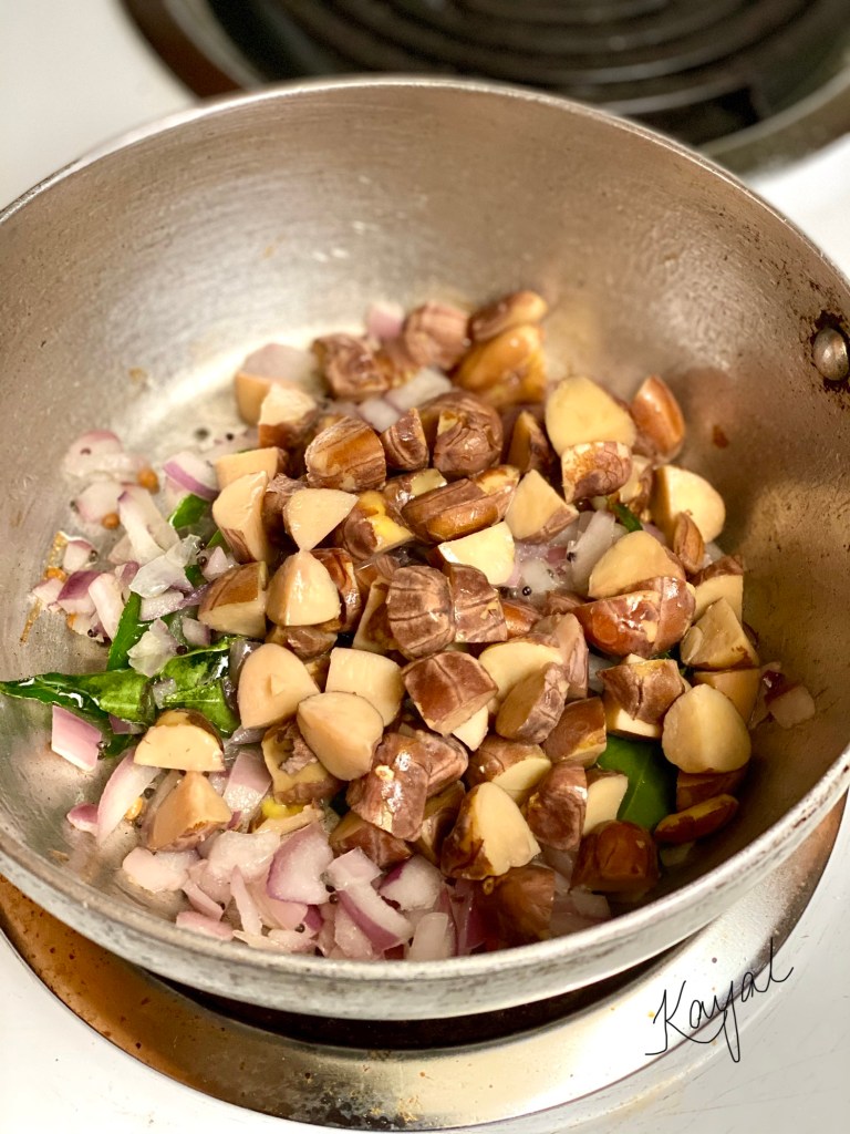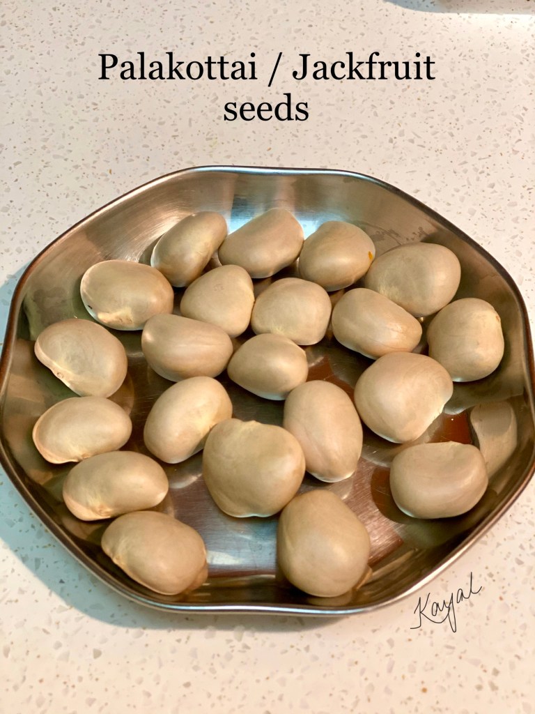 Palakottai poriyal / Jackfruit seeds poriyal is a South-Indian style side-dish. My husband is very fond of jackfruit and used to relish it in India. In the US we can find jackfruit in many stores. Kids are loving it too. So whenever we buy jackfruit, I save the seeds from the fruit and use it in making Sambar or just boil it and eat it as such, similar to boiling groundnuts.