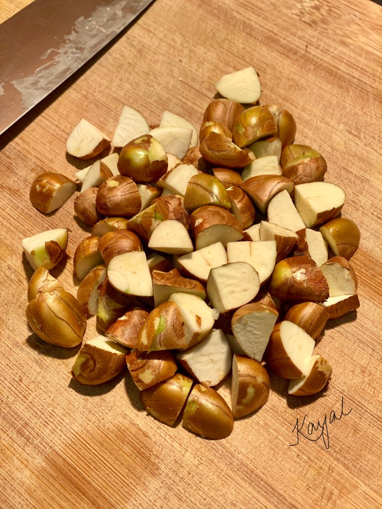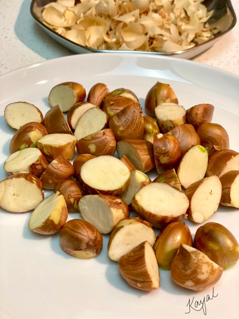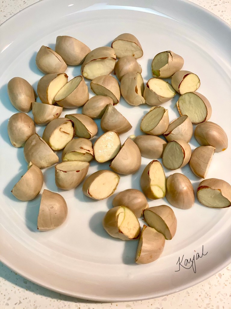 - Cut each seed to half. Then, remove the peel from all the pieces using a small knife.