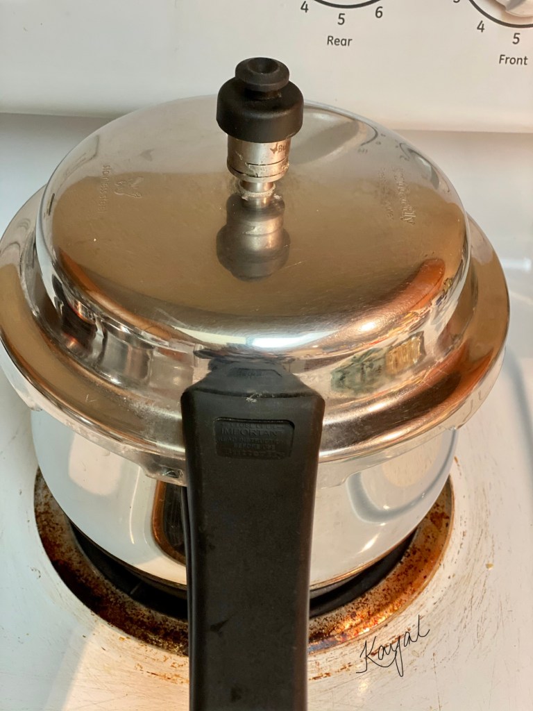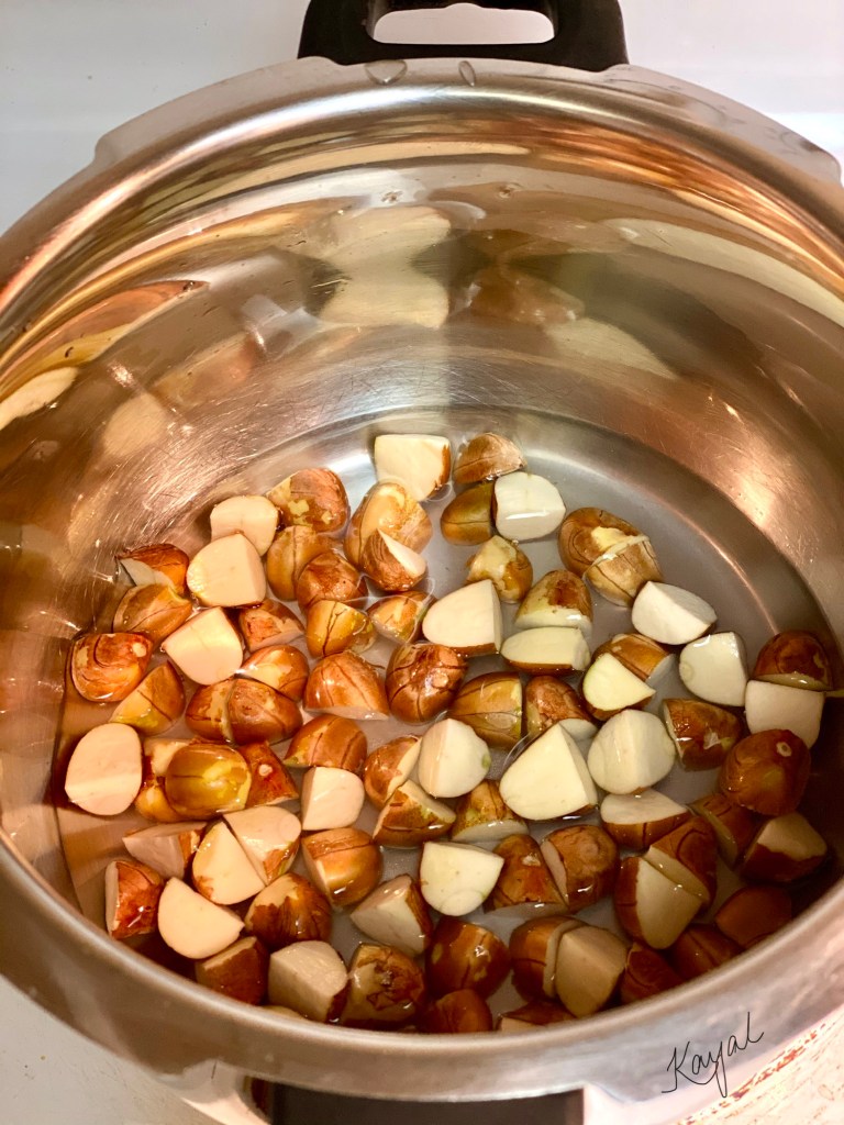 - Add in the chopped and cleaned seeds to a pressure cooker. Add in 1/4 cup water + 1/2 tsp salt and pressure cook for 5 mins.