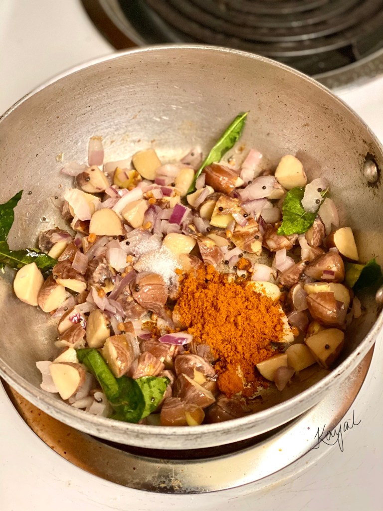This recipe is made with a handful of ingredients that we use in the kitchen everyday. It is super easy to make and very aromatic. The only process would be to remove the outer dried skin from each seed. When we use the seeds after drying them on the kitchen counter for a day or two, the peeling process is pretty simple. Do save up some palakottai and try out this recipe. You will love it. Follow the below steps to make this delicious dish.