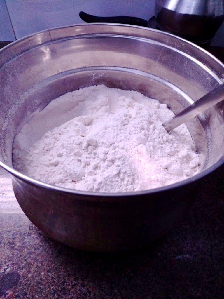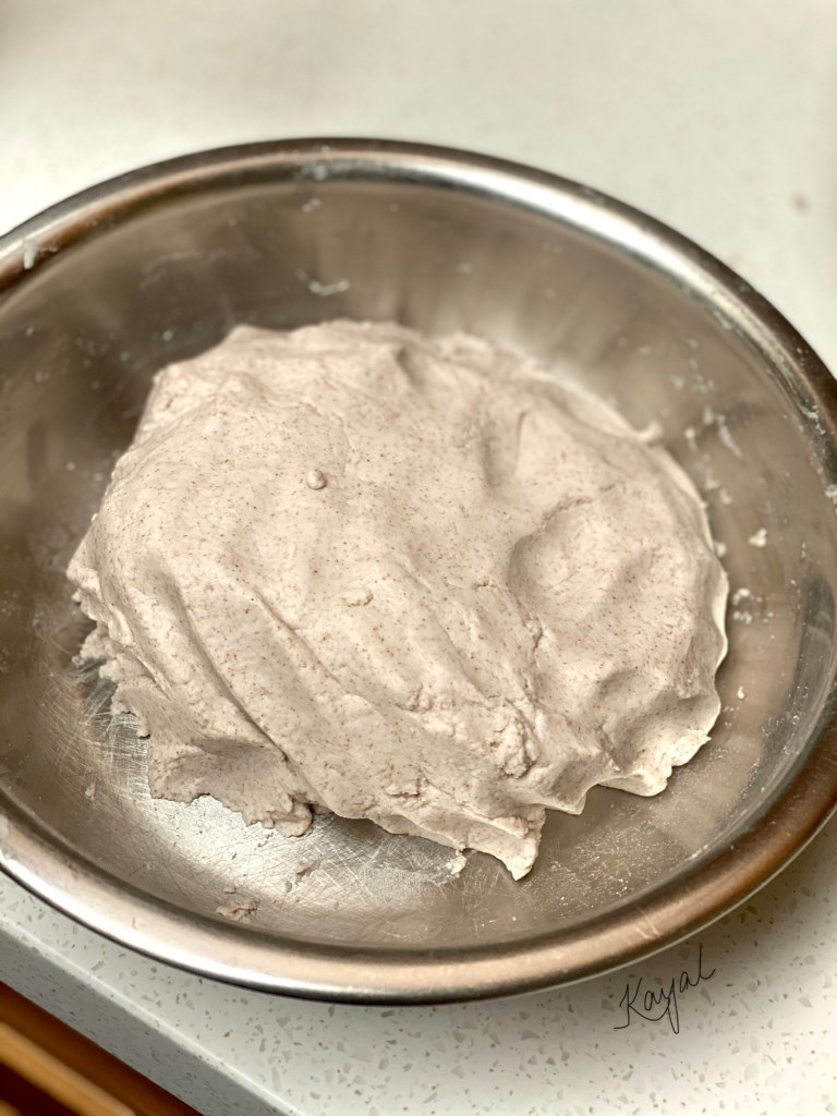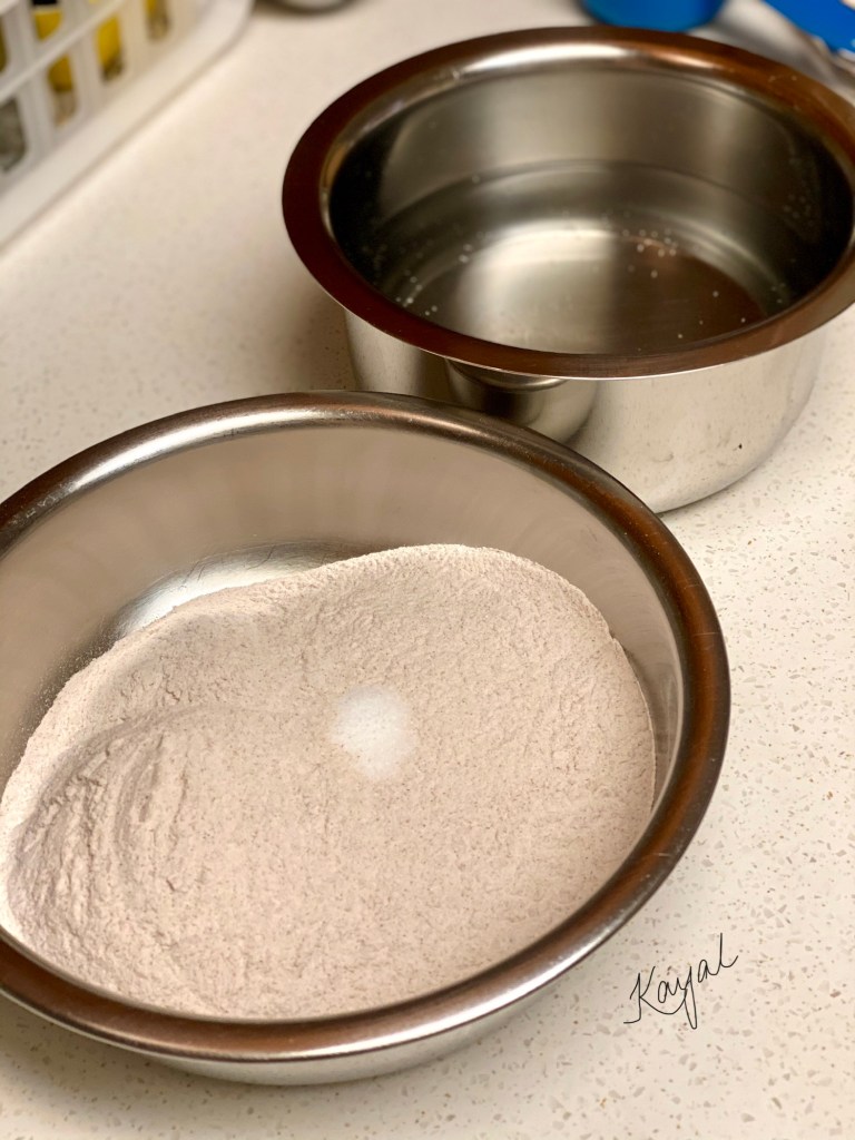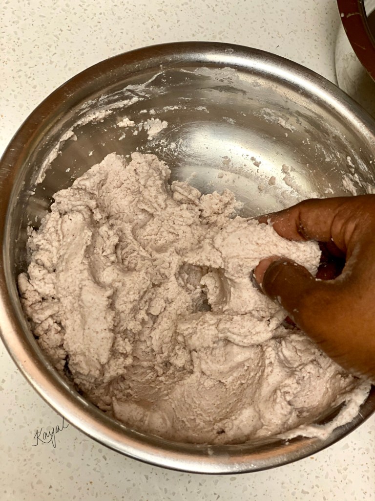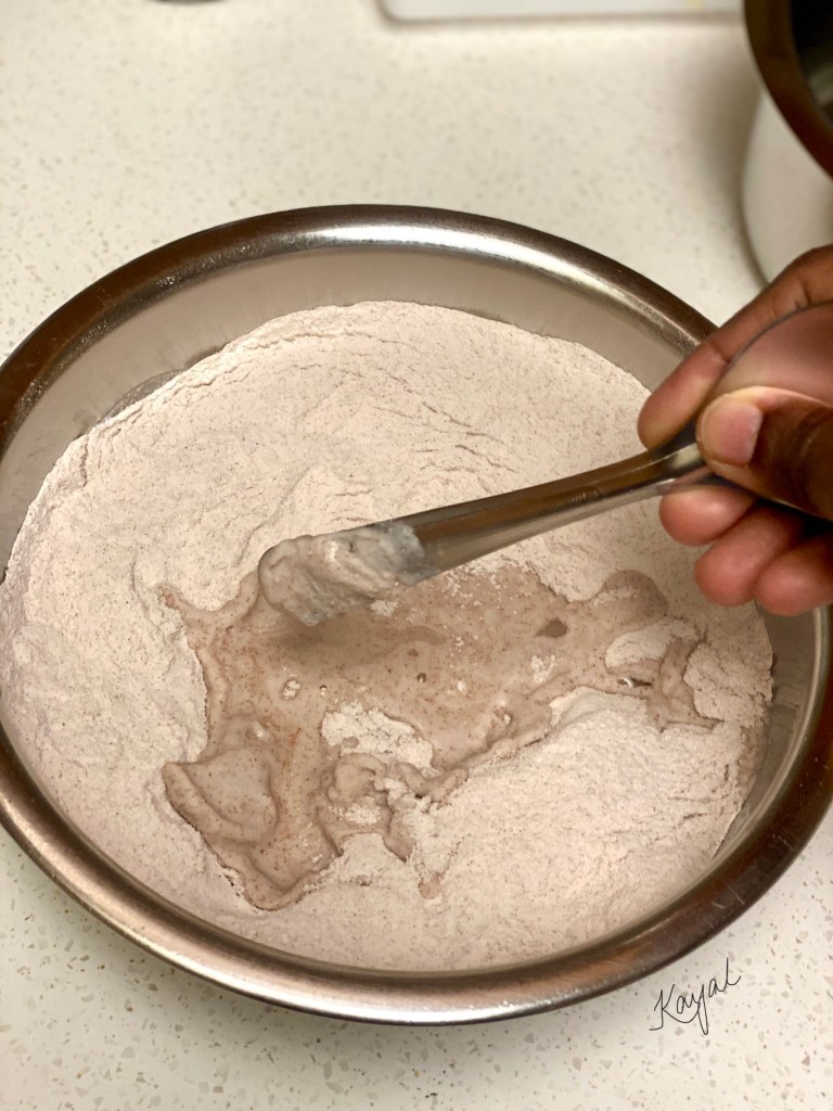 - Add in very warm water in small portions. Keep mixing it using the backside of the spoon till you feel the dough is ready to be kneaded with hand. Be cautious while adding water. The heat should be bearable by now.
