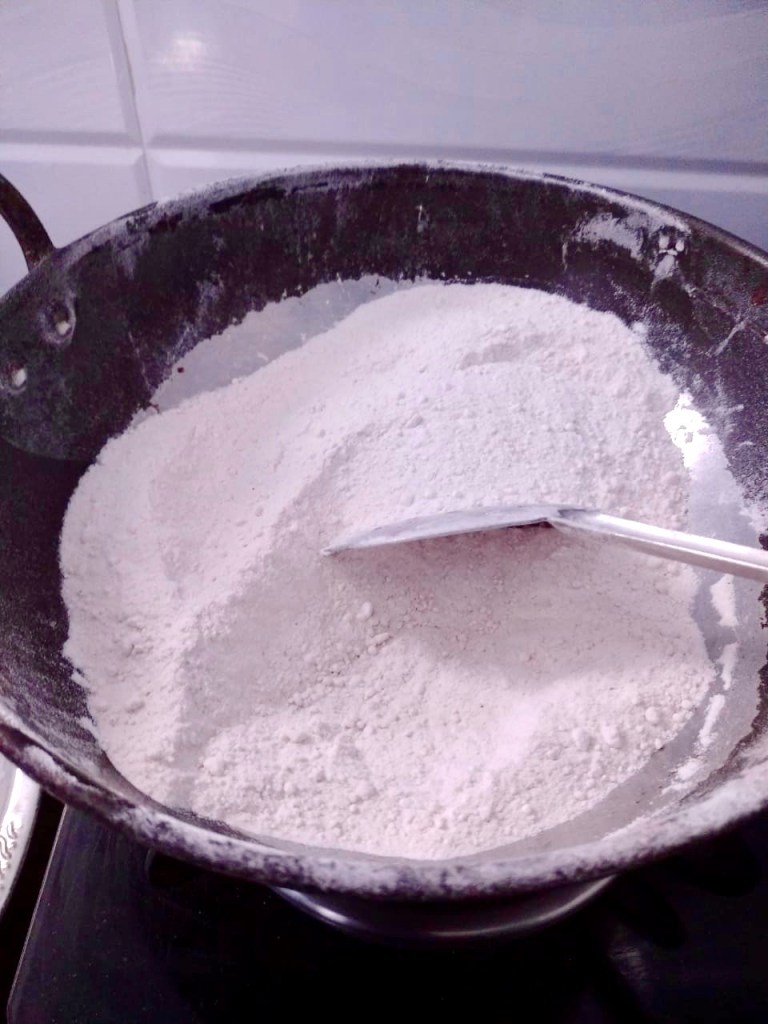 - Keep sauteing till the flour comes to a silky sand like consistency.