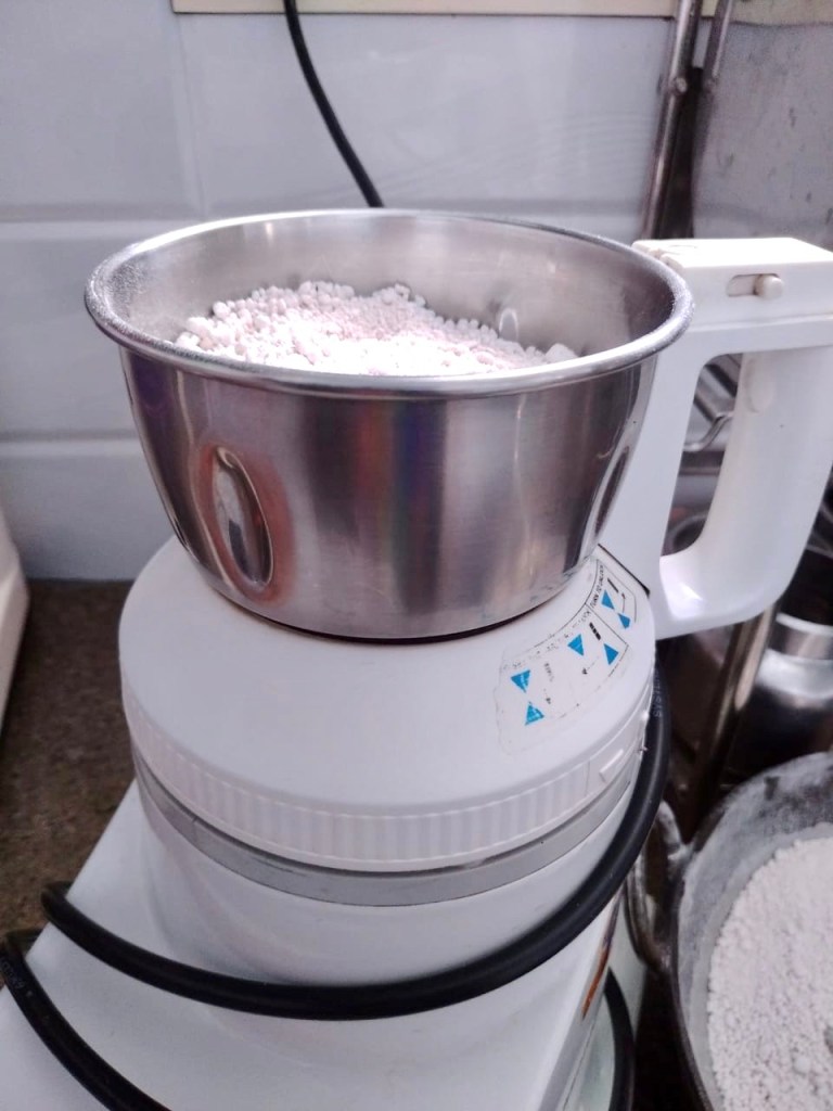 - It should still be slightly wet. Do not dry it completely. Give the rice in a flour mill available in your place and grind it to a very fine powder.