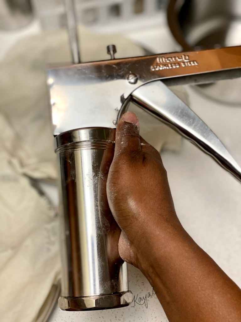 - Mine is a easy to use idiyappam press which also has multipe moulds used to prepare snacks as well. You can use any press of your choice.