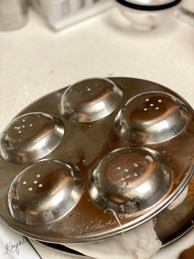 - Add idiyappam dough in the mould. I use a small holed mould for idiyappam. This yields in thin idiyappam. Press it in circular motion in the tray used for steaming. I prepare the idli plates and cover it with a wet cloth.