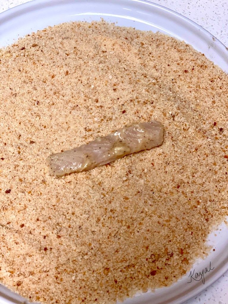 - Coat each fish strip with bread crumbs. Do this step patiently. It gives a very good finish after deep frying.