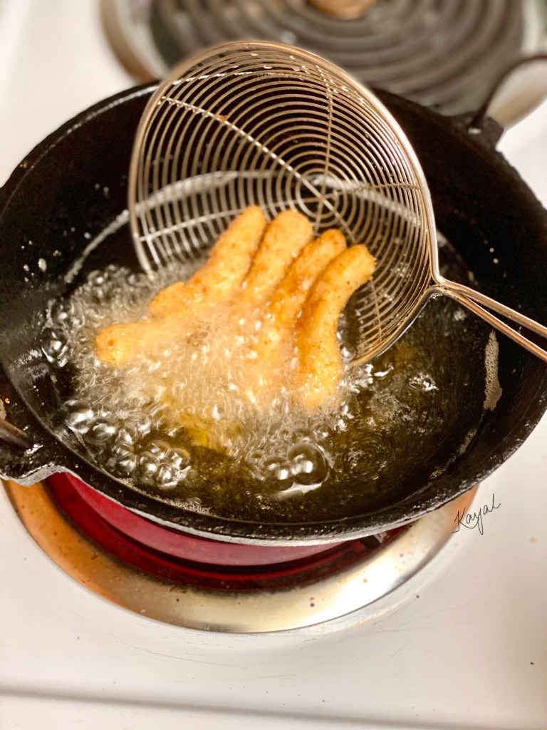 - The strips should not be too thin. Else it will be overcooked in the hot oil.