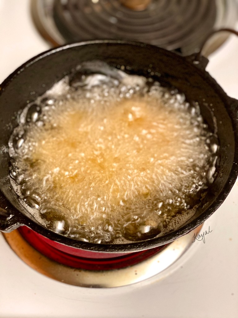 - Meanwhile, heat oil in a thick bottomed pan. I used iron pan.
