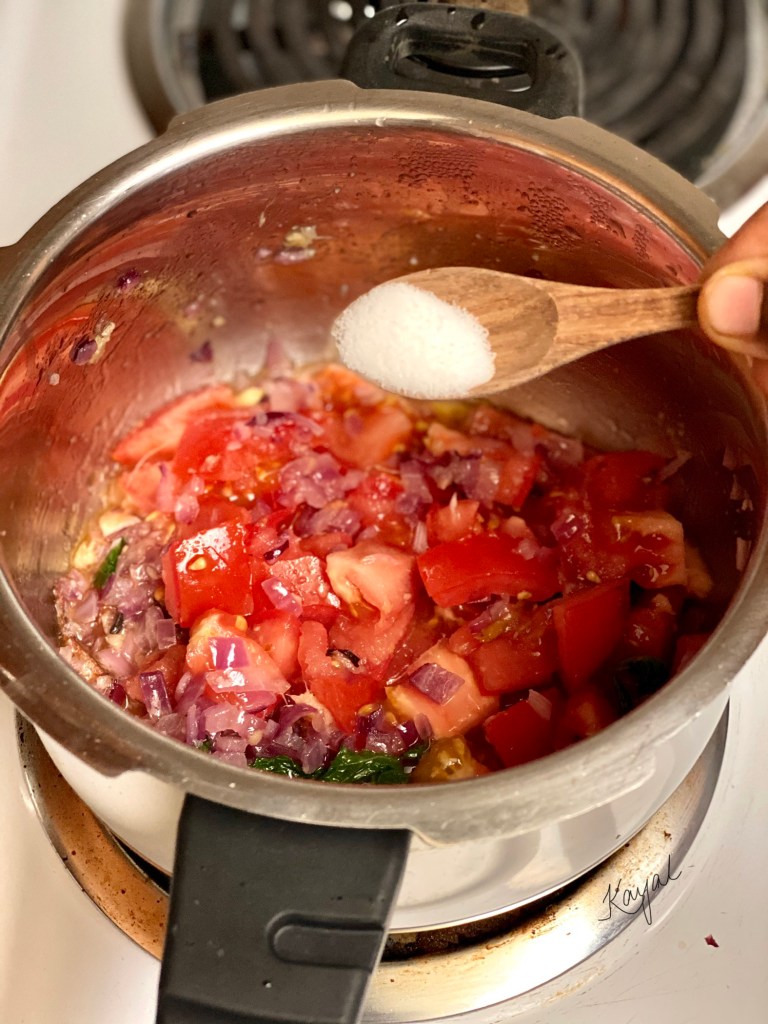 - Now add in the tomatoes + green chilli + 1 tsp salt and cook covered for 1 minute. Cook well till mushy.
