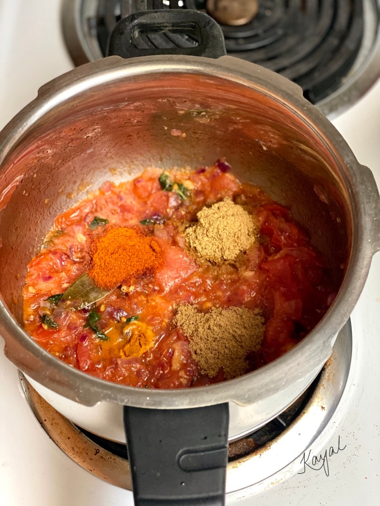 - Add in the masala powders. Red chilli powder, coriander powder, jeera powder and turmeric powder.