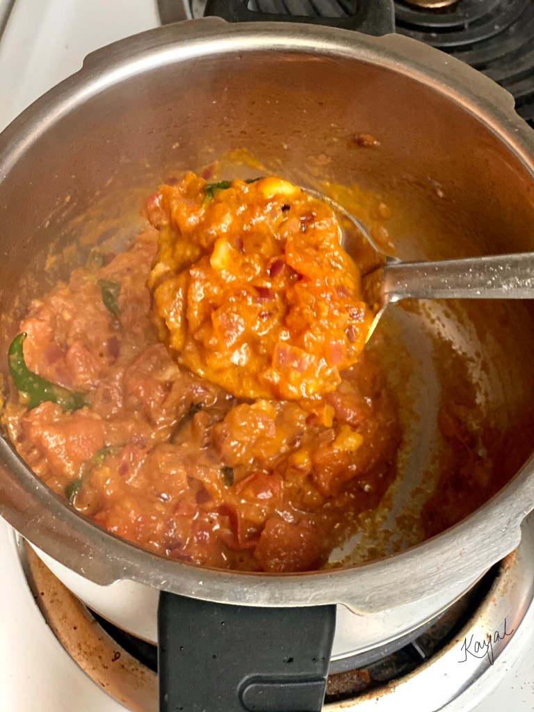 - Once the pressure settles on its own, open the pressure cooker and simmer.