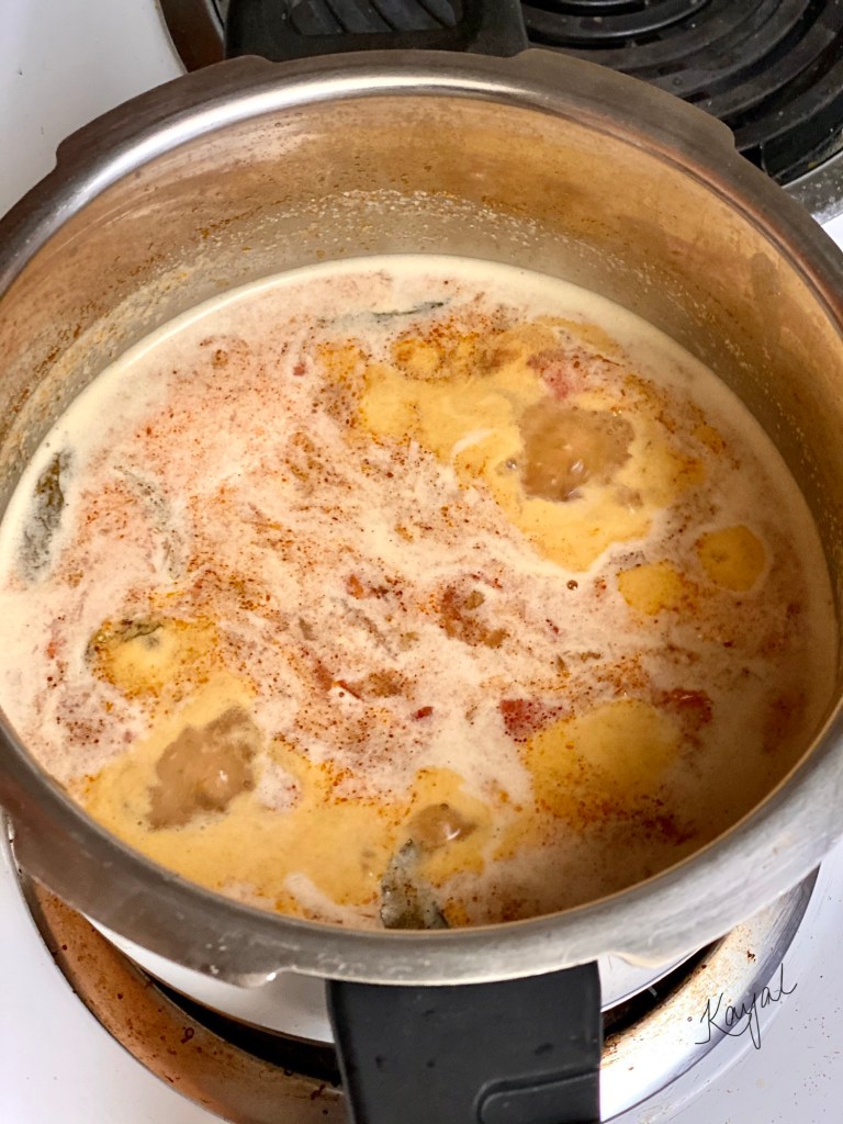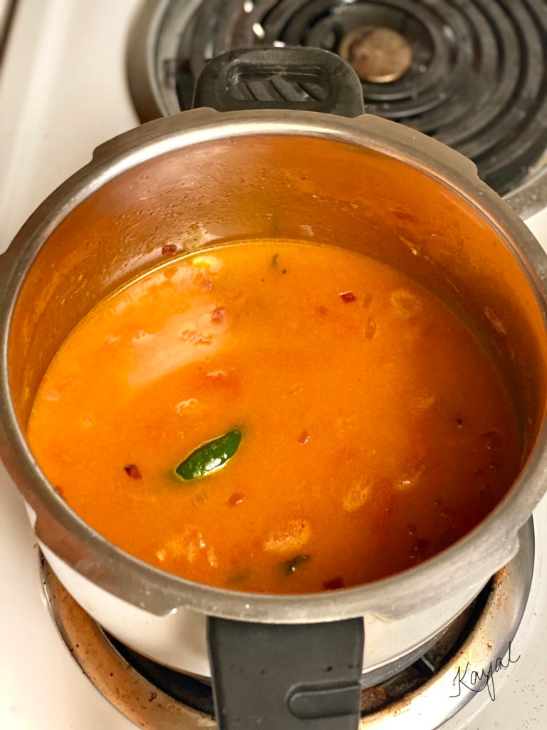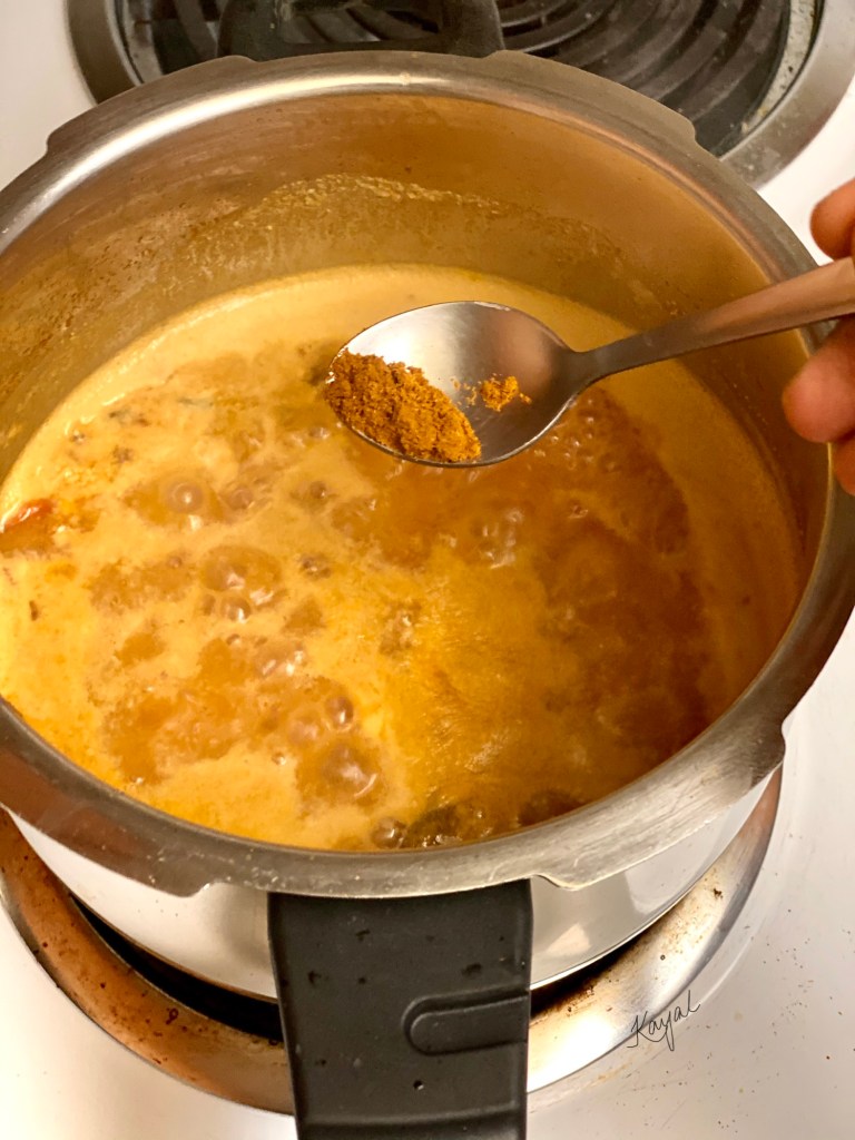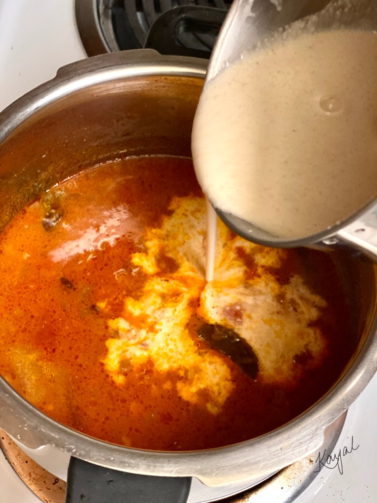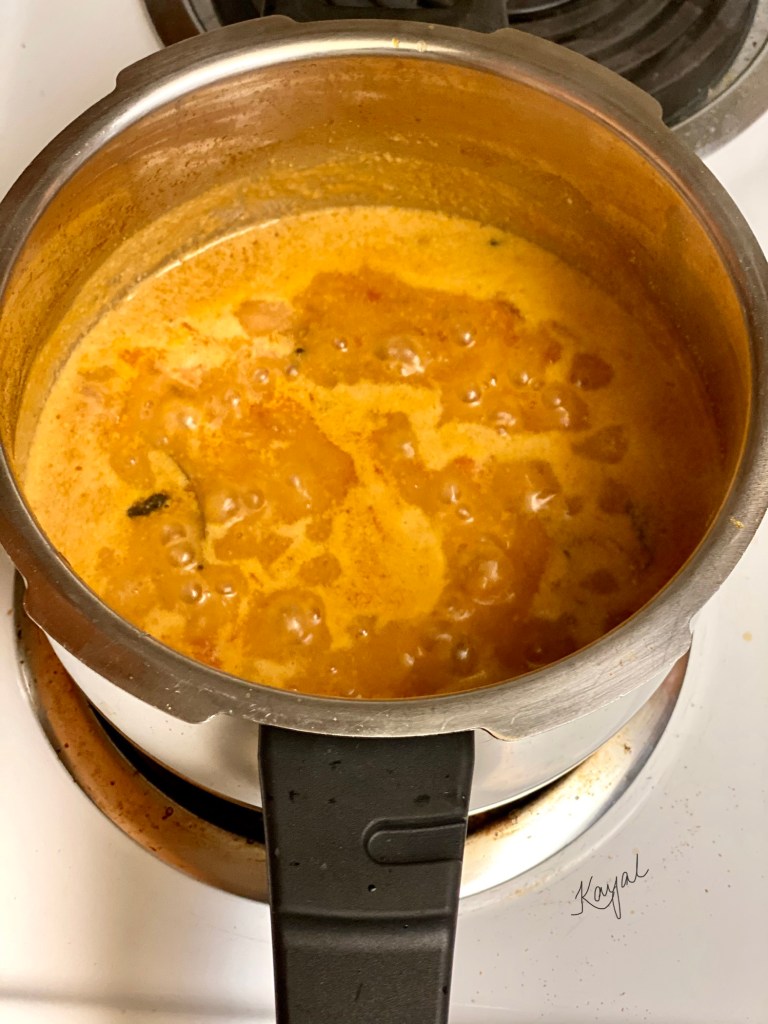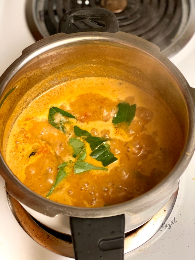 - Add in the grinded paste and wash the mixie with 1/2 cup water and add it to the cooker. Let the mixture boil in medium flame.