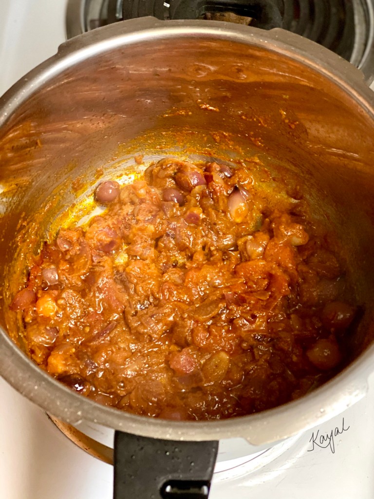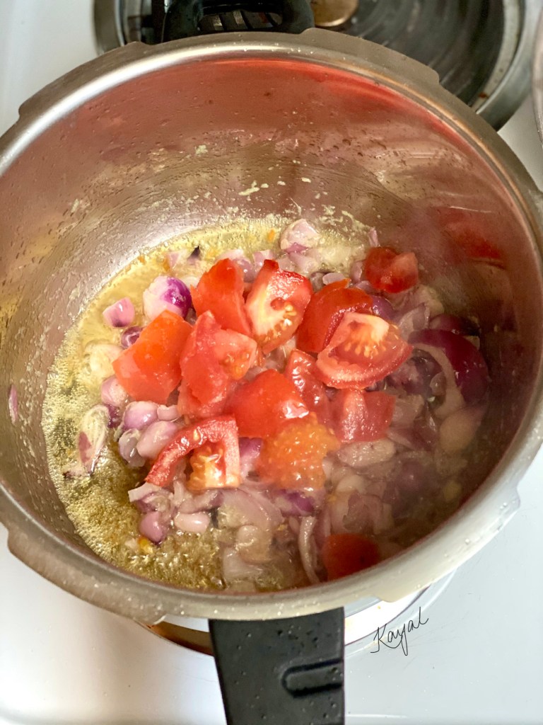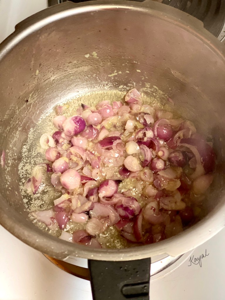 - In a pressure cooker, add in oil. Once the oil is hot, add in the chopped onion.