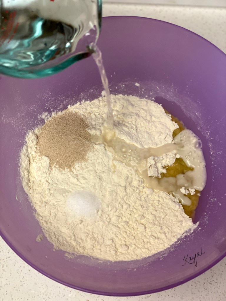 - Add warm water and start kneading the dough. You can either use your hands to knead or use a stand mixer. I hand kneaded the dough.