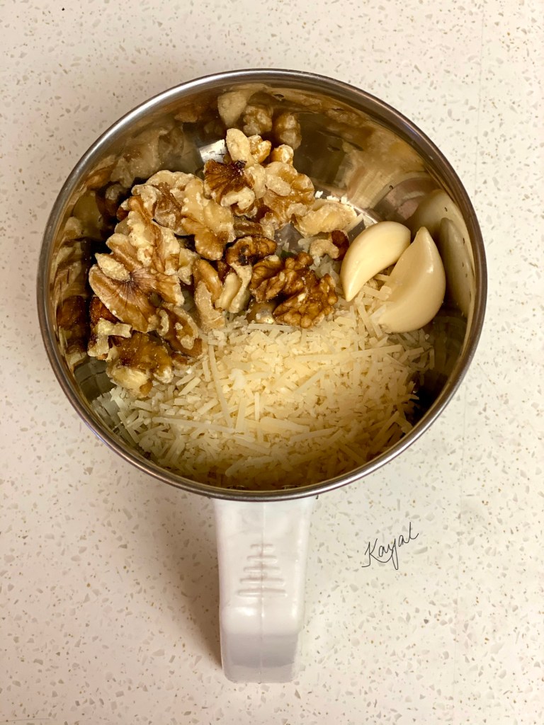 - Grind walnuts, garlic, salt and parmesan cheese.
