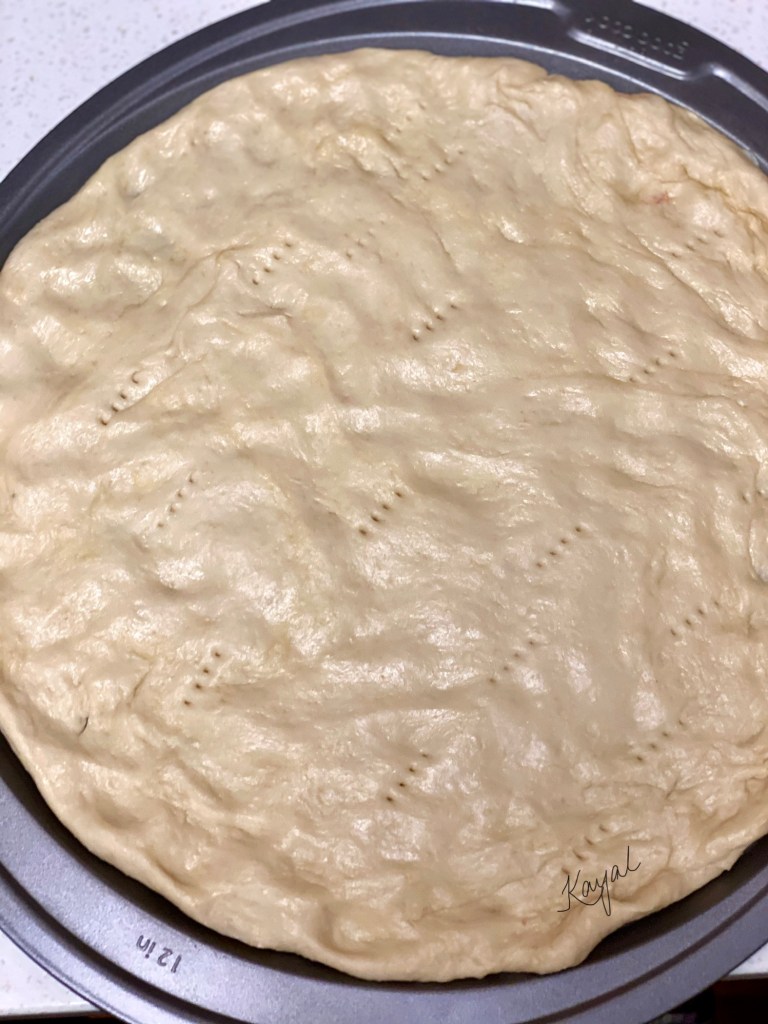 - In an oven safe pan, lightly coat the surface with a parchment paper or spread some olive oil. Then, spread the required pizza dough to desired thickness. I used a 12 inches pan.