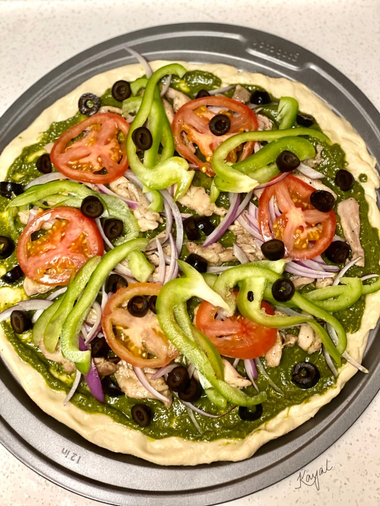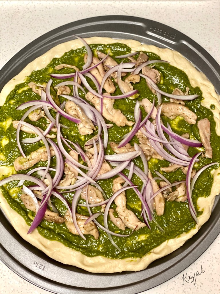 My instant idea was to make some homemade chicken pesto pizza with minimal toppings. It turned out absolutely delicious. Also had some leftover pesto which was used to make some delicious “Pesto Spaghetti with Parmesan Cheese”!
