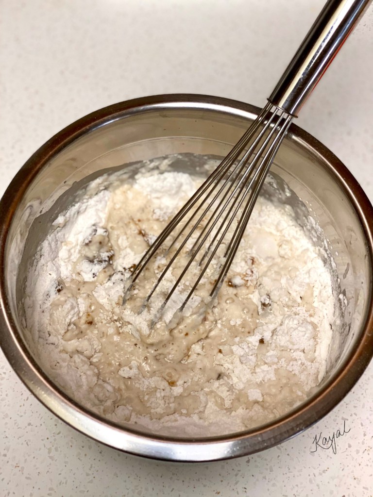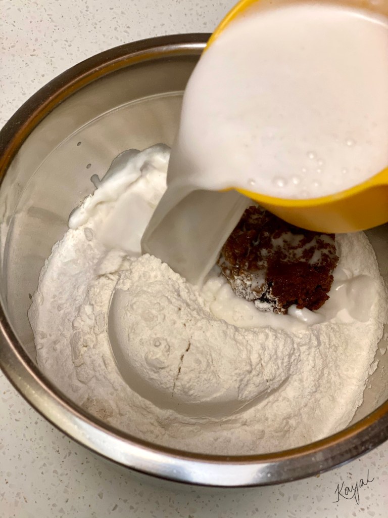 - In a mixing bowl, add all purpose flour, rice flour, strained thick karupatti syrup (mine looks this way as I used the one that I stored in the refrigerator), thick coconut milk and salt. Use a whisk and mix everything well till smooth.