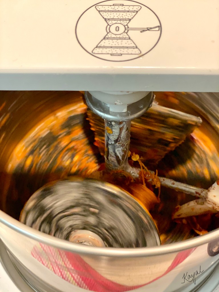 - In a grinder or mixie, add in the dry red chillies + 1 tbsp salt and grind it.