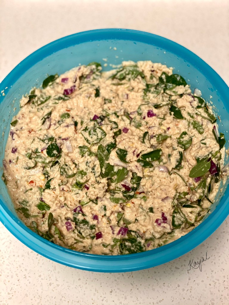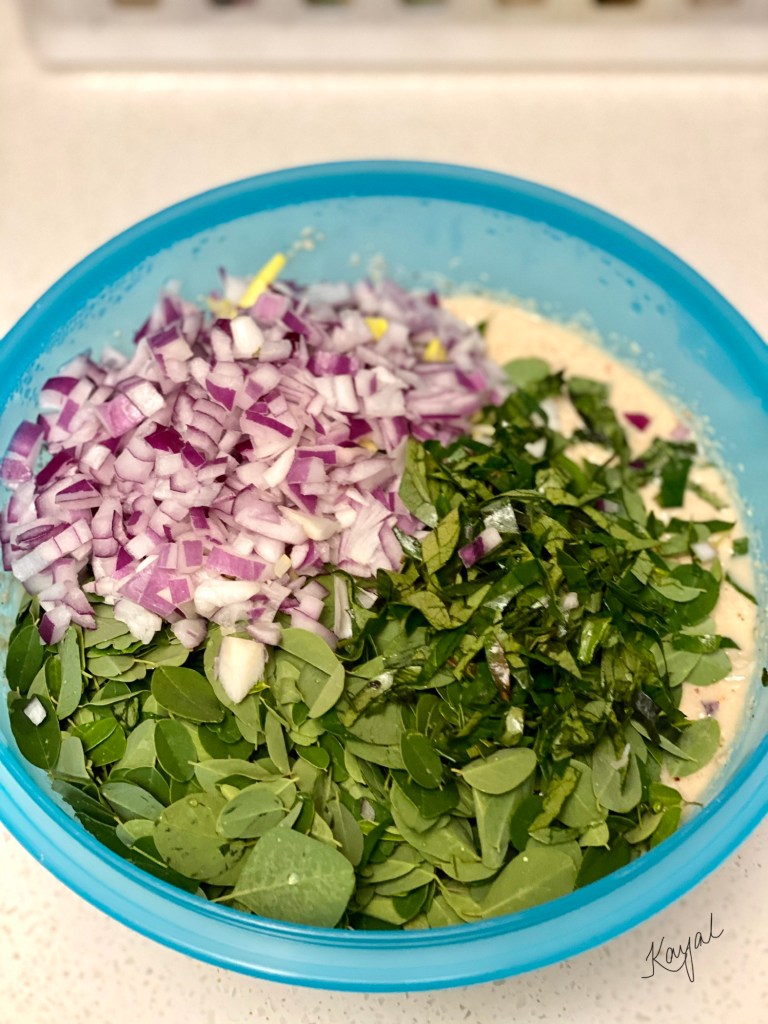- Now add in the finely chopped onions, curry leaves and drumstick leaves and mix well till combined.