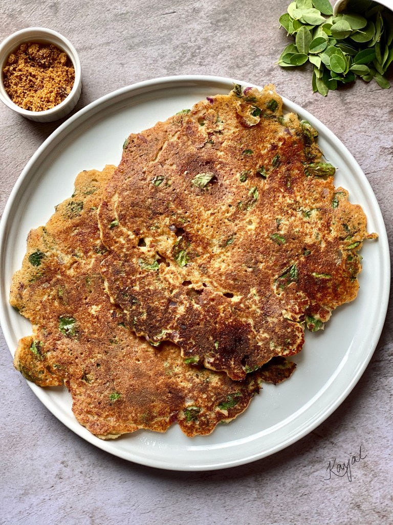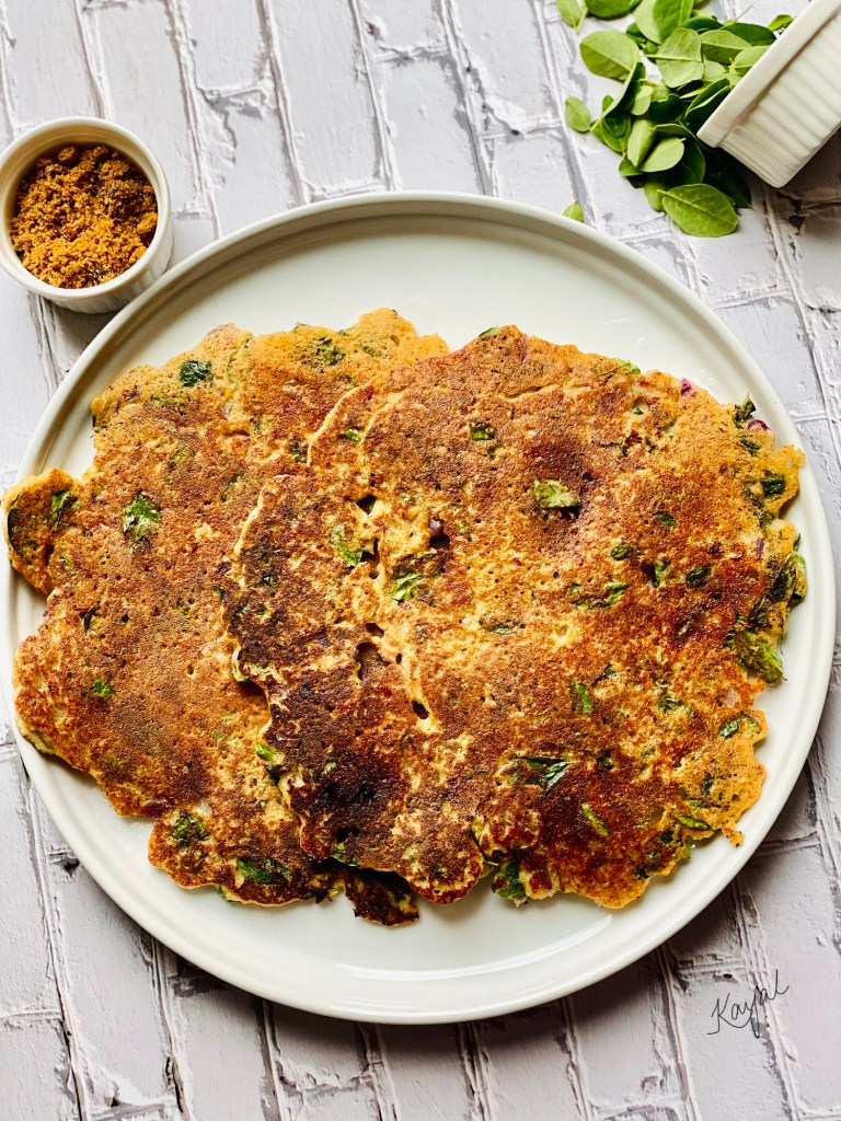 Adai is a thick protein rich dish that is made with dal and rice. I have substituted the rice with millets. The batter does not need fermentation. By adding millets, this becomes a even more nutritious meal and also feels lighter on the tummy. I always add murungai keerai (drumstick leaves/morninga leaves) to adai batter which enhances taste and has lot of health benefits.