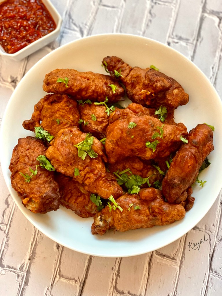 - Dip each chicken wing in the batter and deep fry till done and crisp.